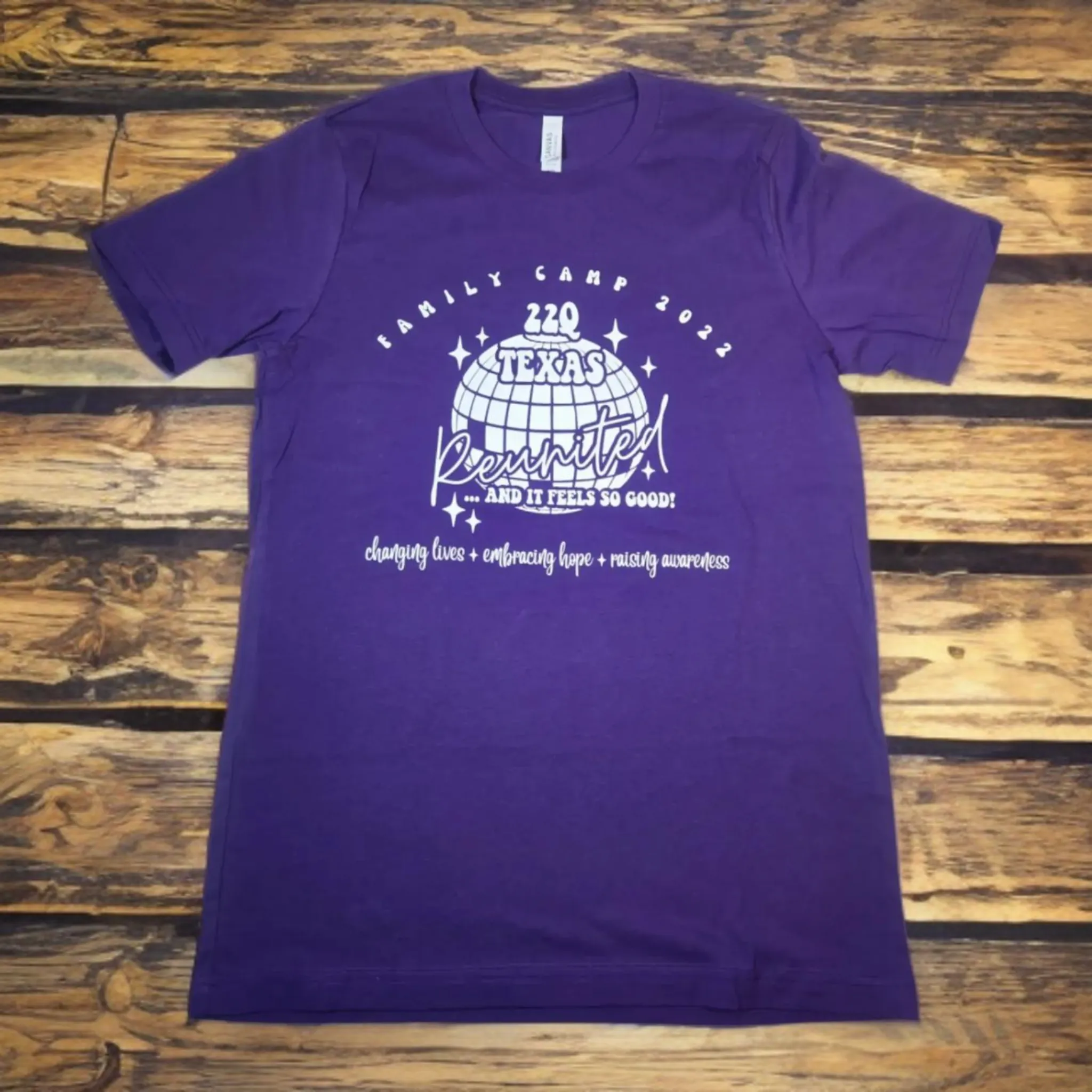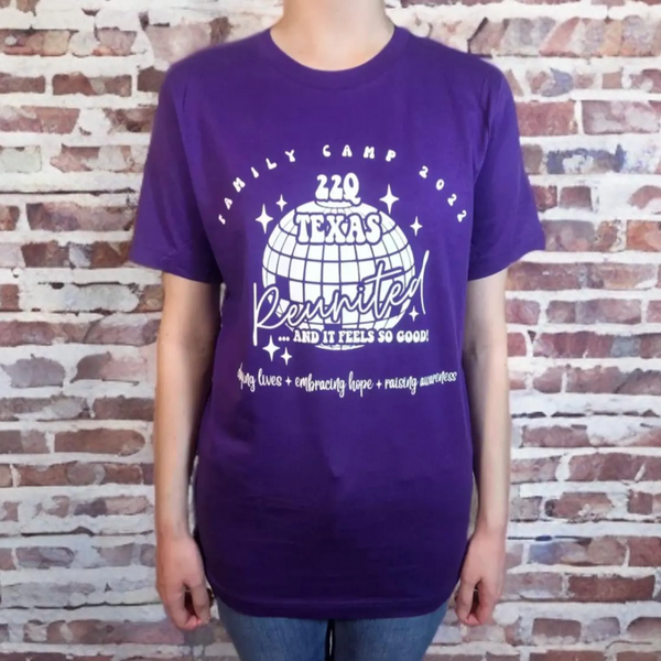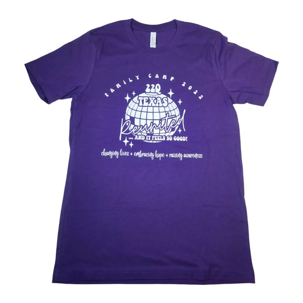 Shine in this groovy, purple, 2022 adult camp shirt! Featuring a funky disco ball design that celebrates the joy of being together again. As the saying goes, "Reunited and it feels so good!" This fun tee captures all the excitement of camp friendships rekindled in 2022. The perfect wearable memory for your whole family!