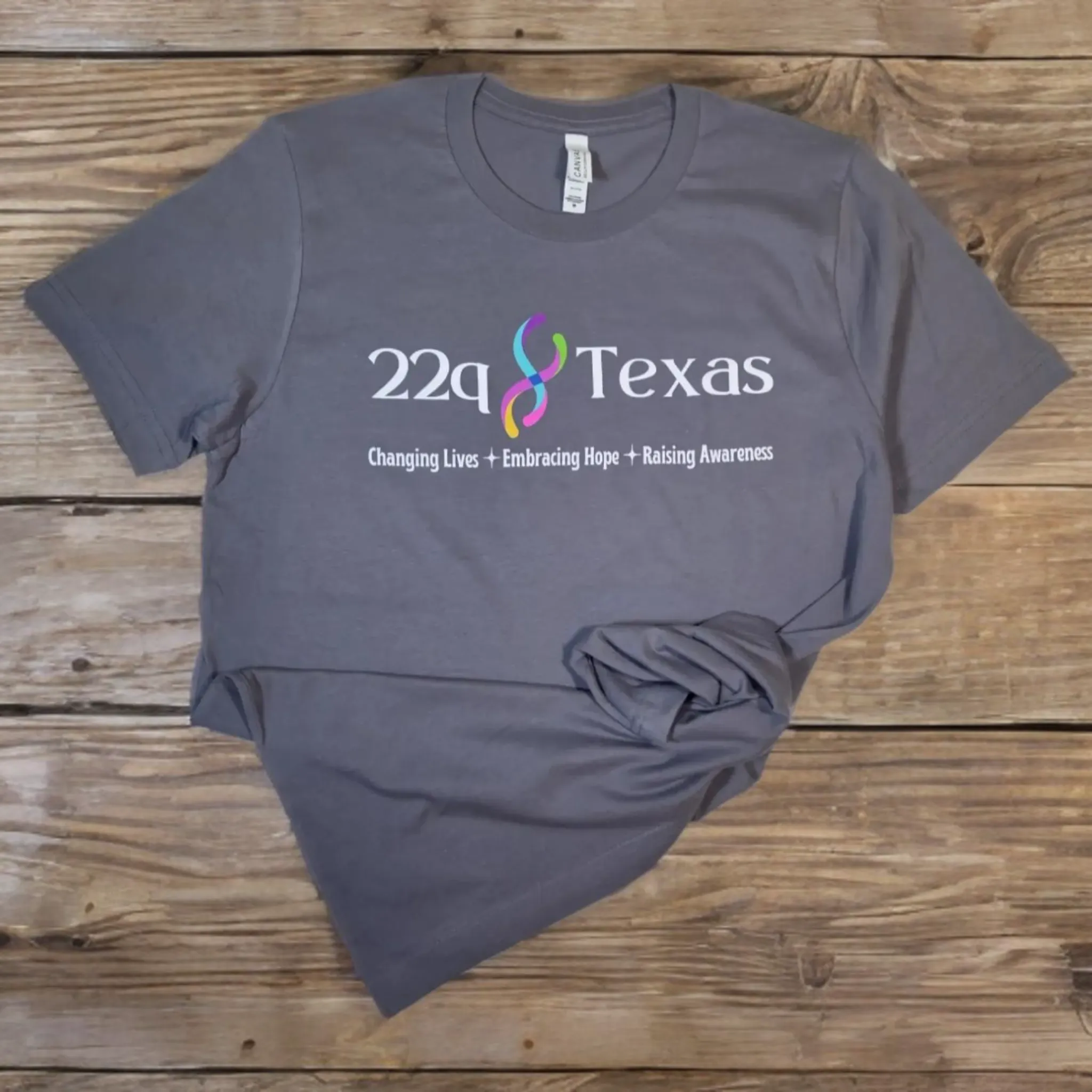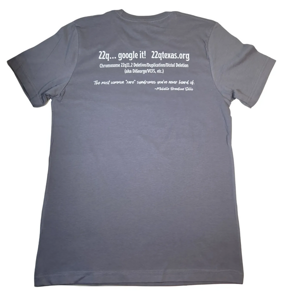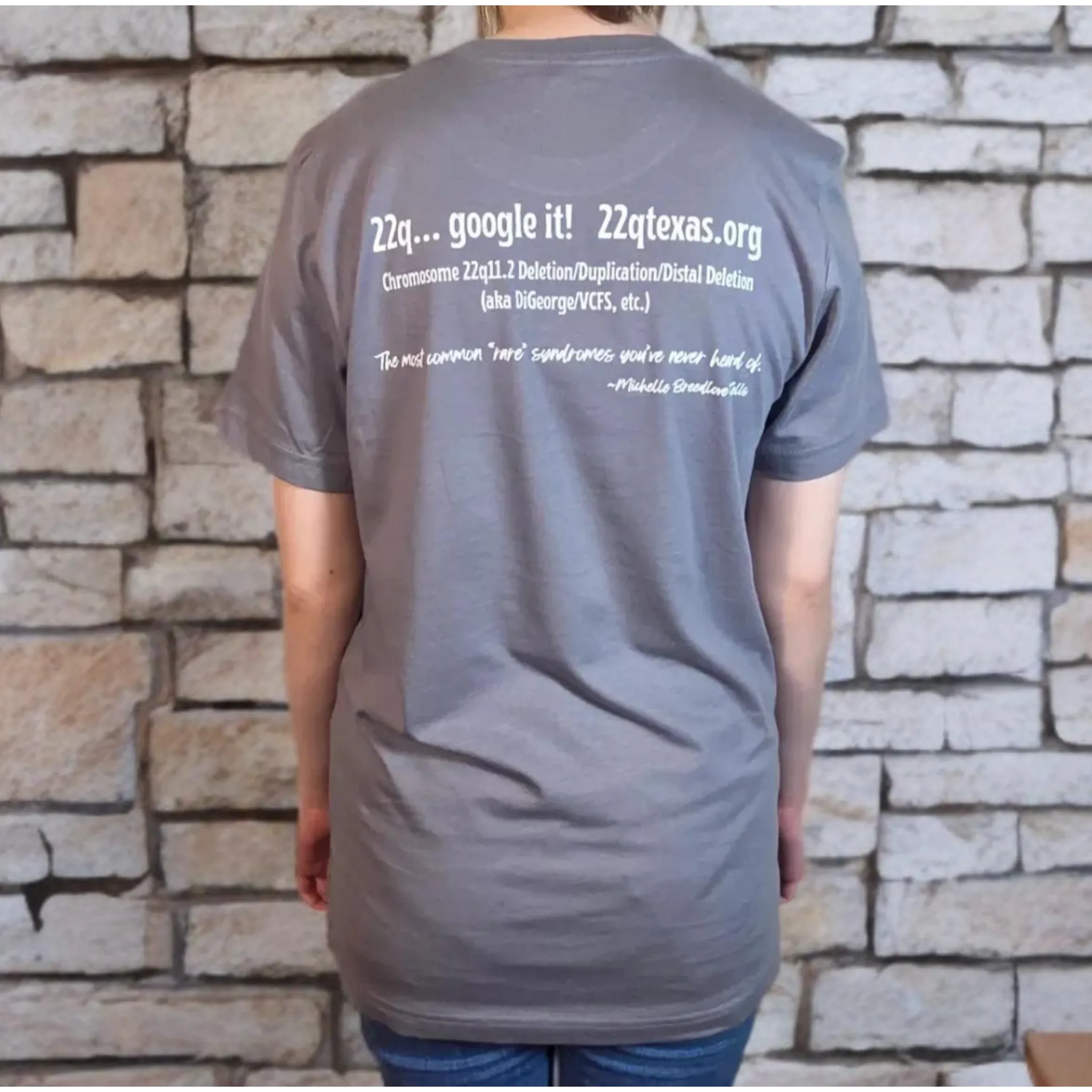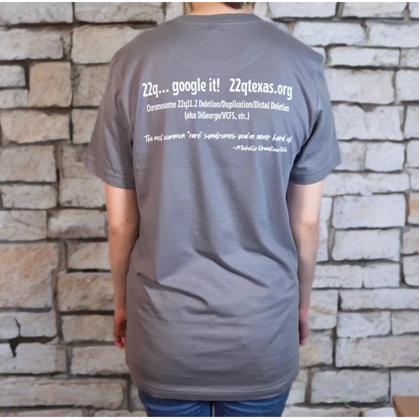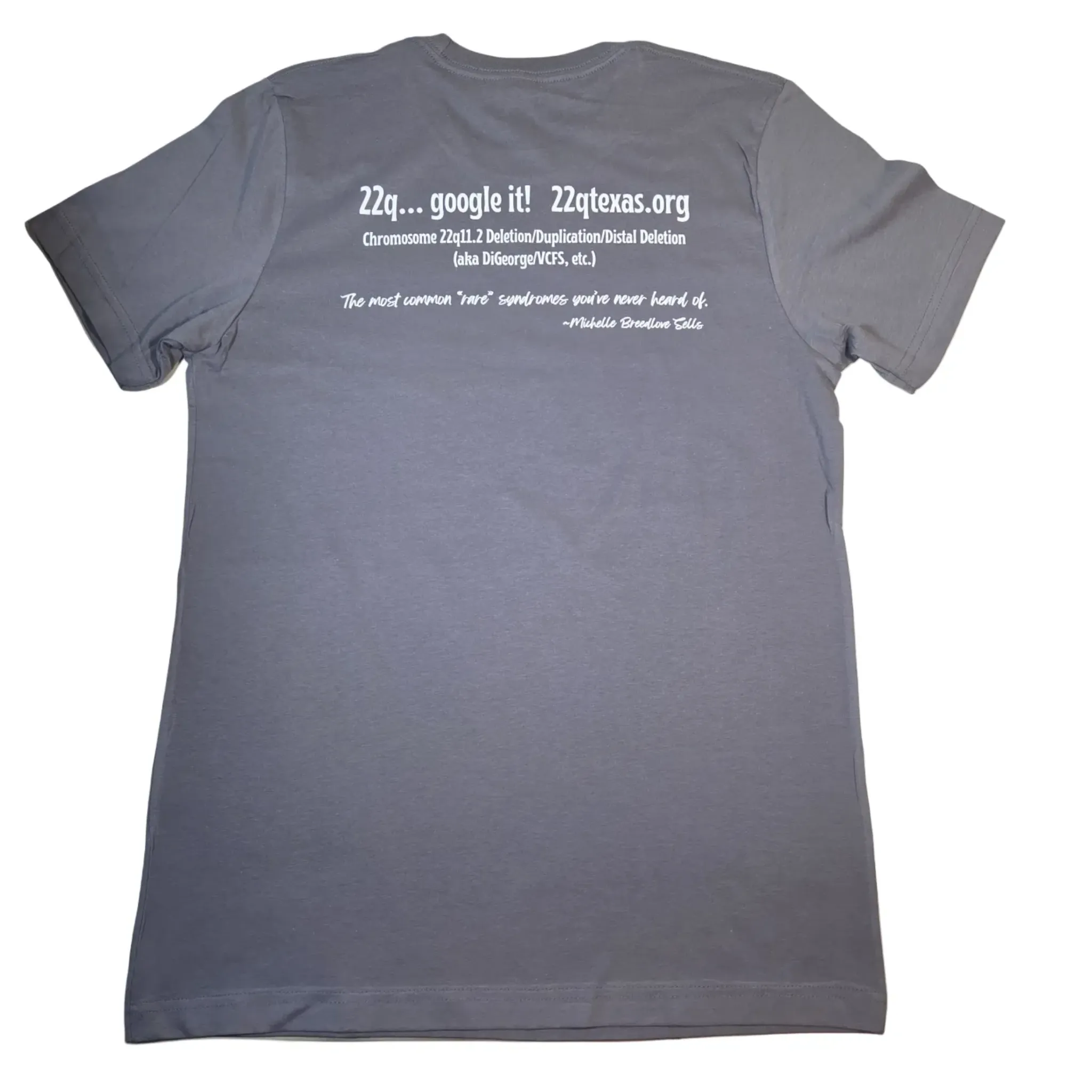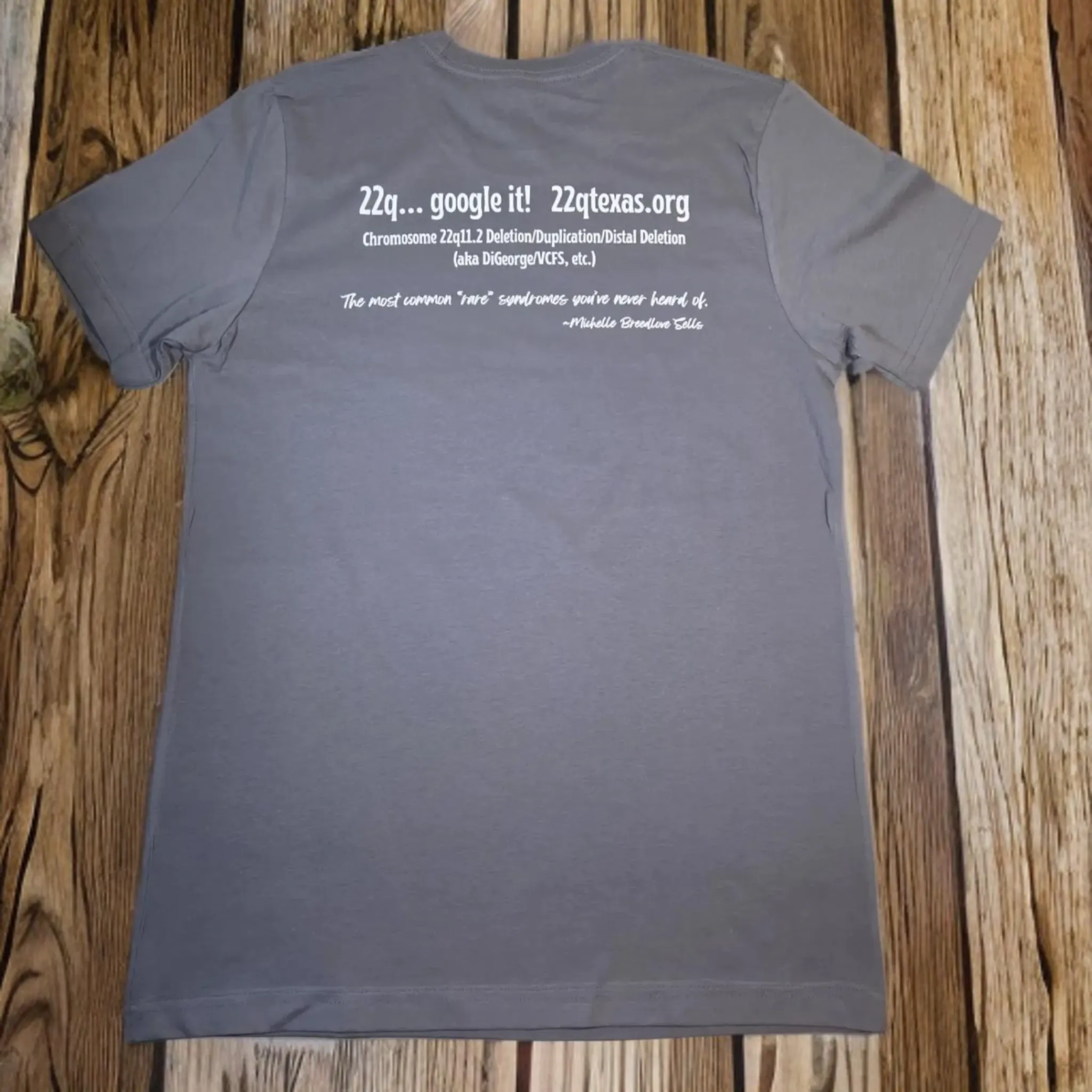 Boldly showcase your support with our new 22q Texas logo adult awareness shirts in striking gray. Made from 100% Airlume combed and ring-spun cotton by Bella + Canvas, these premium shirts combine comfort with a cause. Available in sizes small to 4XL, wear your advocacy with attitude while raising 22q...