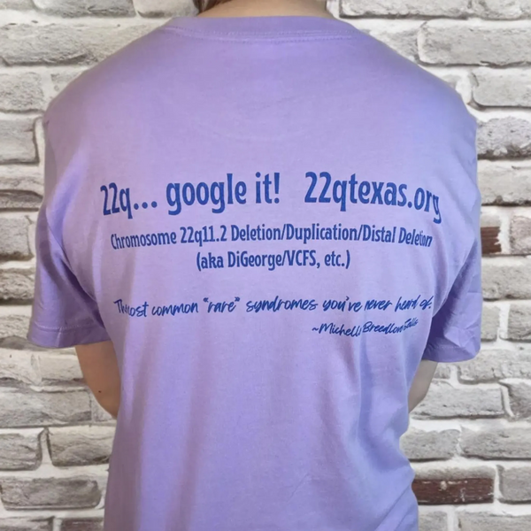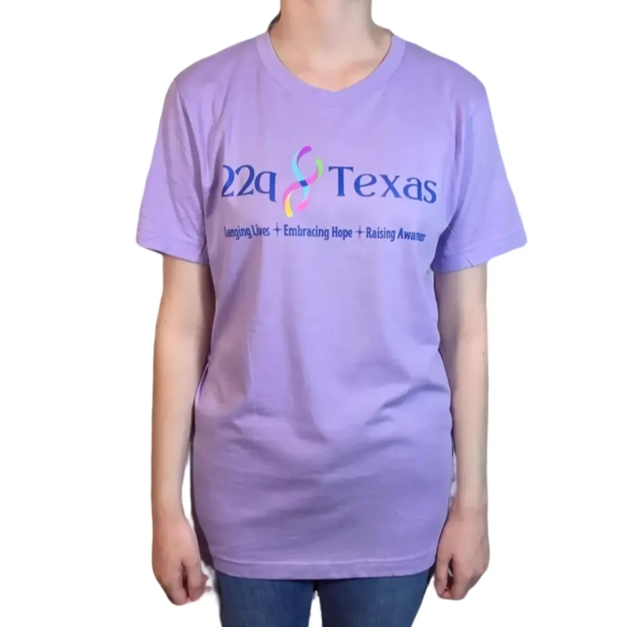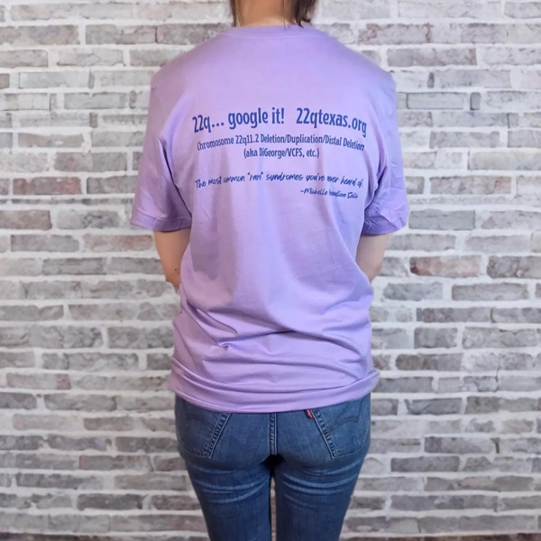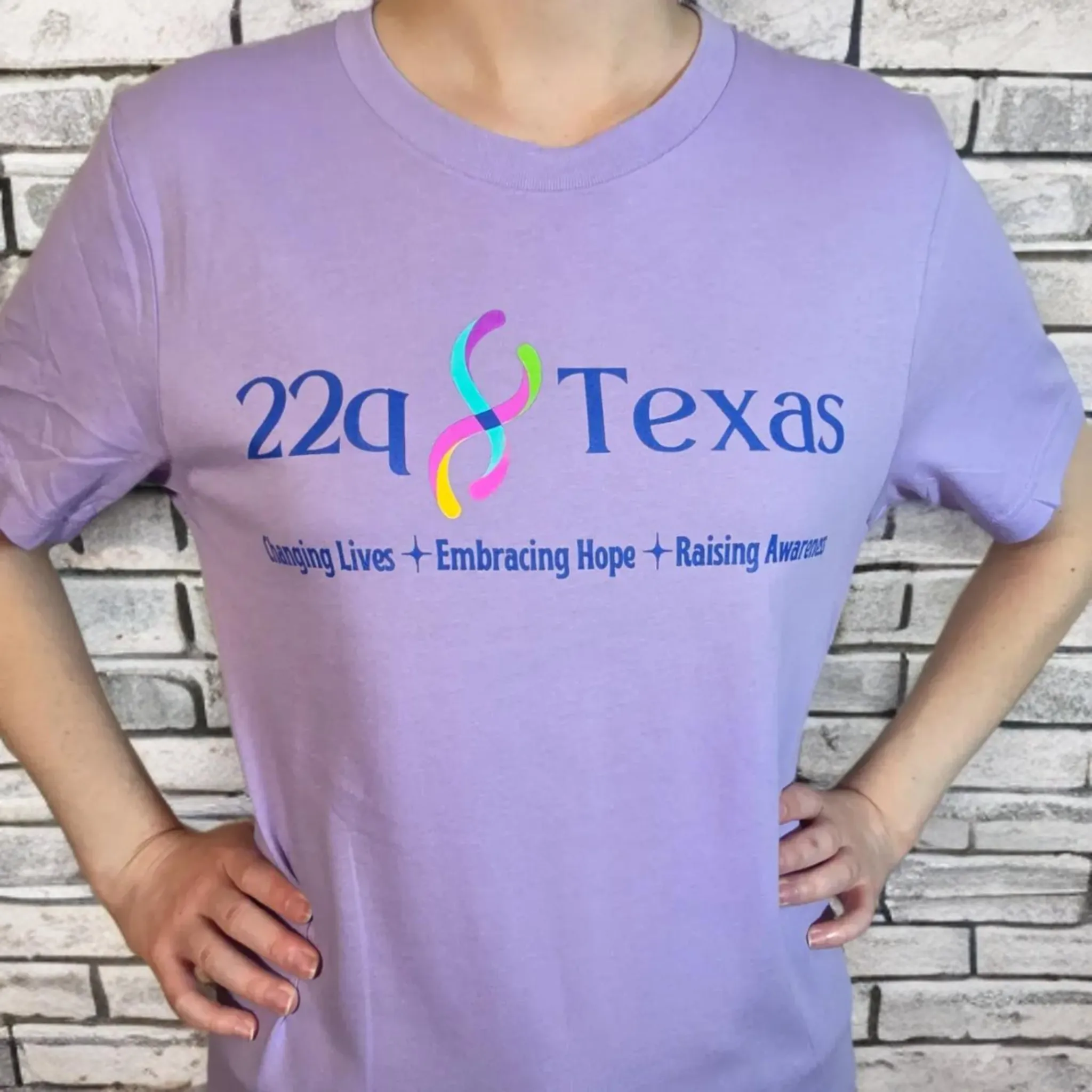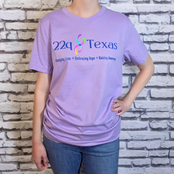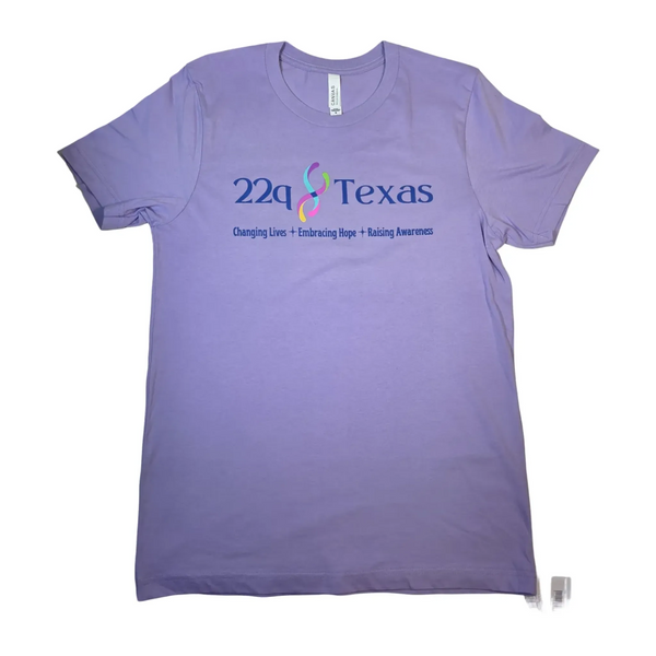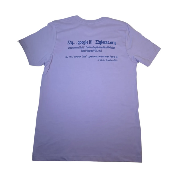 Boldly showcase your support with our new 22q Texas logo adult awareness shirts in striking lavender. Made from 100% Airlume combed and ring-spun cotton by Bella + Canvas, these premium shirts combine comfort with a cause. Available in sizes small to 4XL, wear your advocacy with attitude while raising 22q awareness across Texas and beyond!