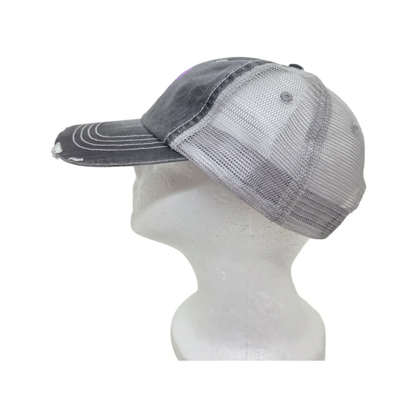 Show your 22q awareness with this stylish black and gray mesh-back hat featuring a vibrant neon purple glitter "22Q Mom" design. The adjustable sizing ensures a comfortable fit for all, making it perfect for everyday wear or awareness events. A meaningful way to connect with the 22q community while looking great.