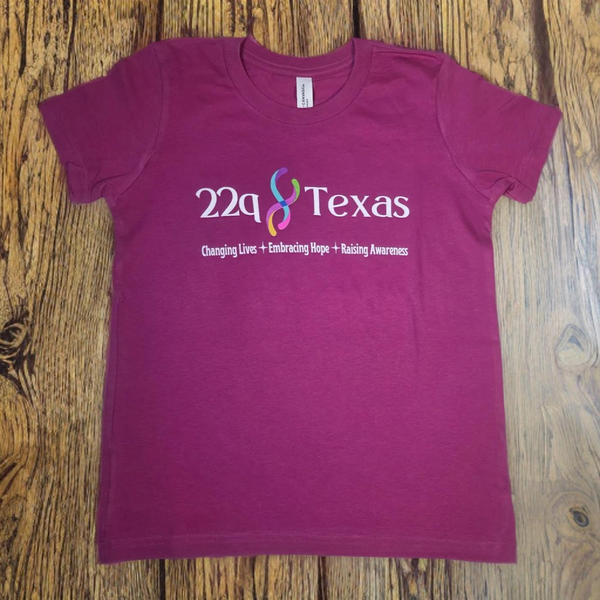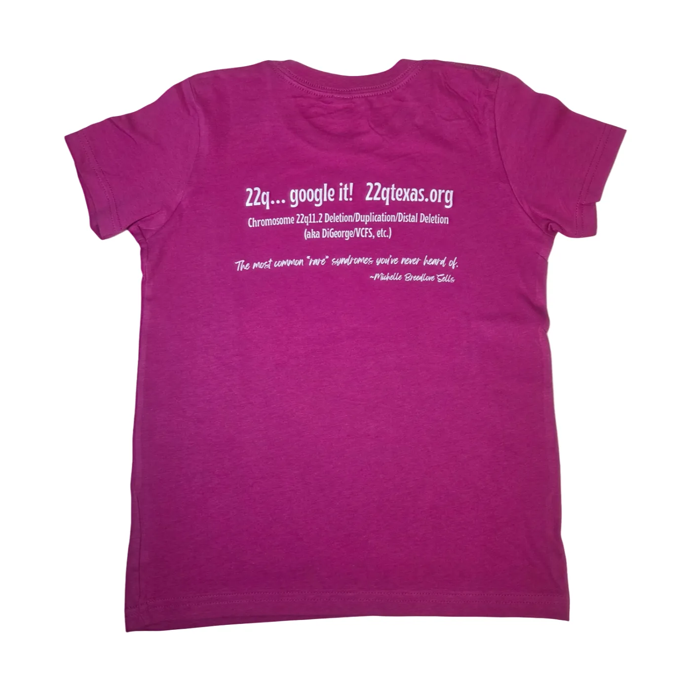 Outfit your youngster in this cheerful, pink youth tee showcasing our bold new 22q Texas logo! Ideal for spreading awareness with comfort and flair. The eye-catching design draws interest and opens dialogues about 22q, ensuring your child looks cute while supporting an important cause!