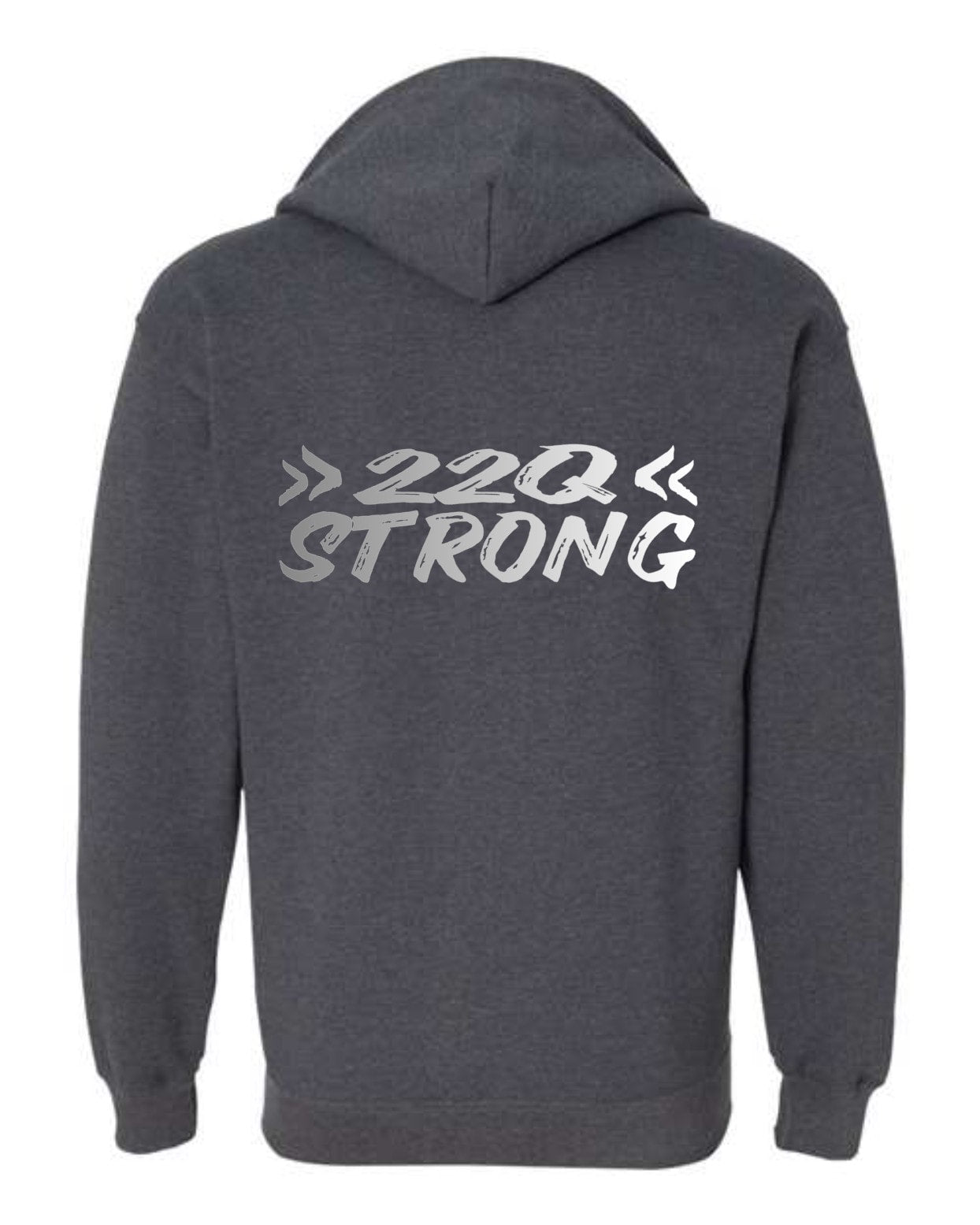 This fun zip up hoodie features ">>22Q Strong<<" saying in silver! The same design in on the front and back, with the front being a pocket size design, and the back being a large design.