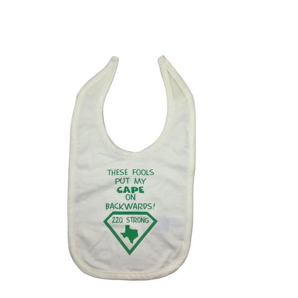 If there's one thing I've learned, 22q kiddos are tough! In fact, they're heroes in my book! Celebrate their hero side with the "cheeky" bib that says "the fools put my CAPE on backwards!" Also includes the 22q Texas Strong superhero logo.