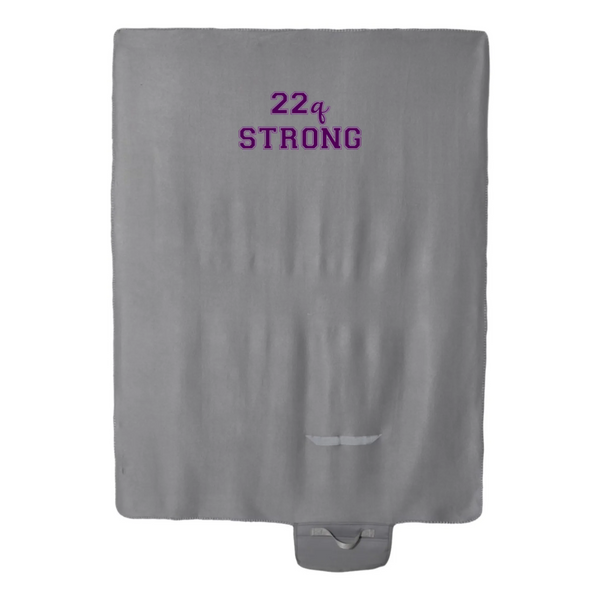Stay cozy and spread awareness with this portable, roll-up 47"W x 53"L gray fleece travel blanket. Emblazoned with "22q STRONG" in either purple or green, it's perfect for sporting events, hospital stays, or as an essential addition to your emergency go bag. This versatile travel companion rolls up easily while spreading 22q awareness.