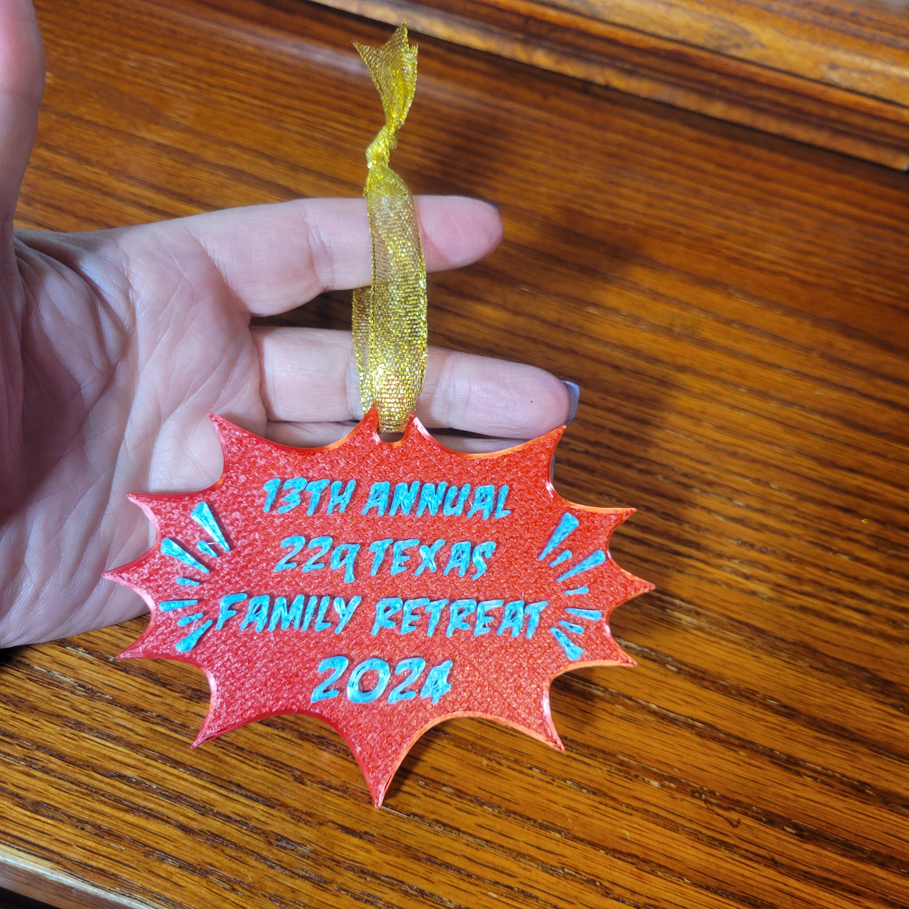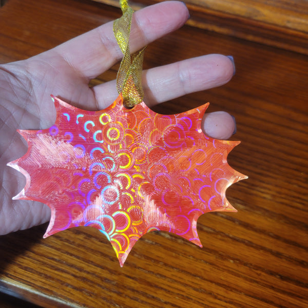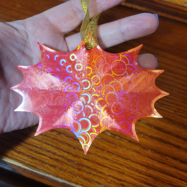 3D printed, plastic ornament with gold ribbon. The back of the ornament has a circular, holographic pattern.