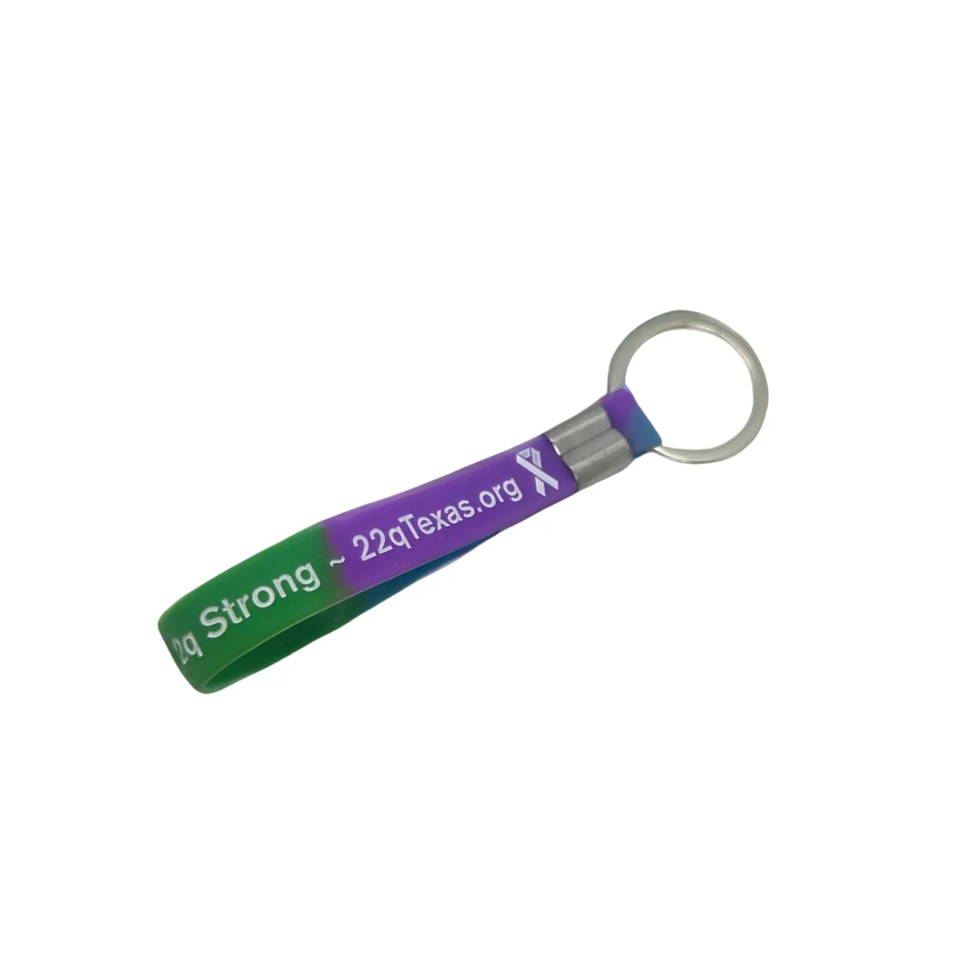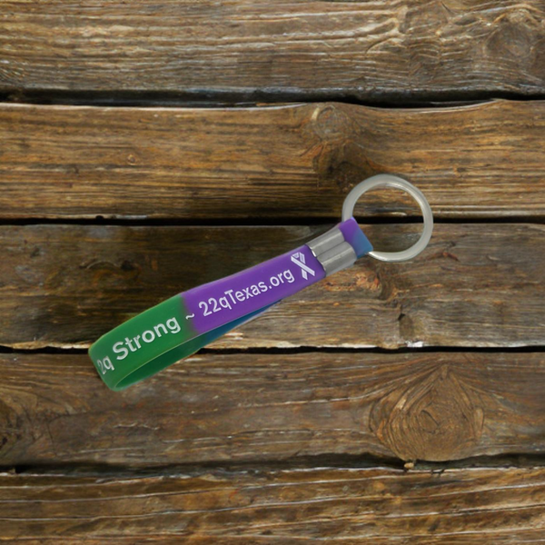 This silicone wrist keychain features a durable 1.25" silver-colored key ring and prominently displays 22q Texas awareness symbolism. Designed for convenience, it securely attaches to your wrist while keeping keys accessible. An essential accessory that combines practicality with meaningful advocacy for the 22q Texas community.