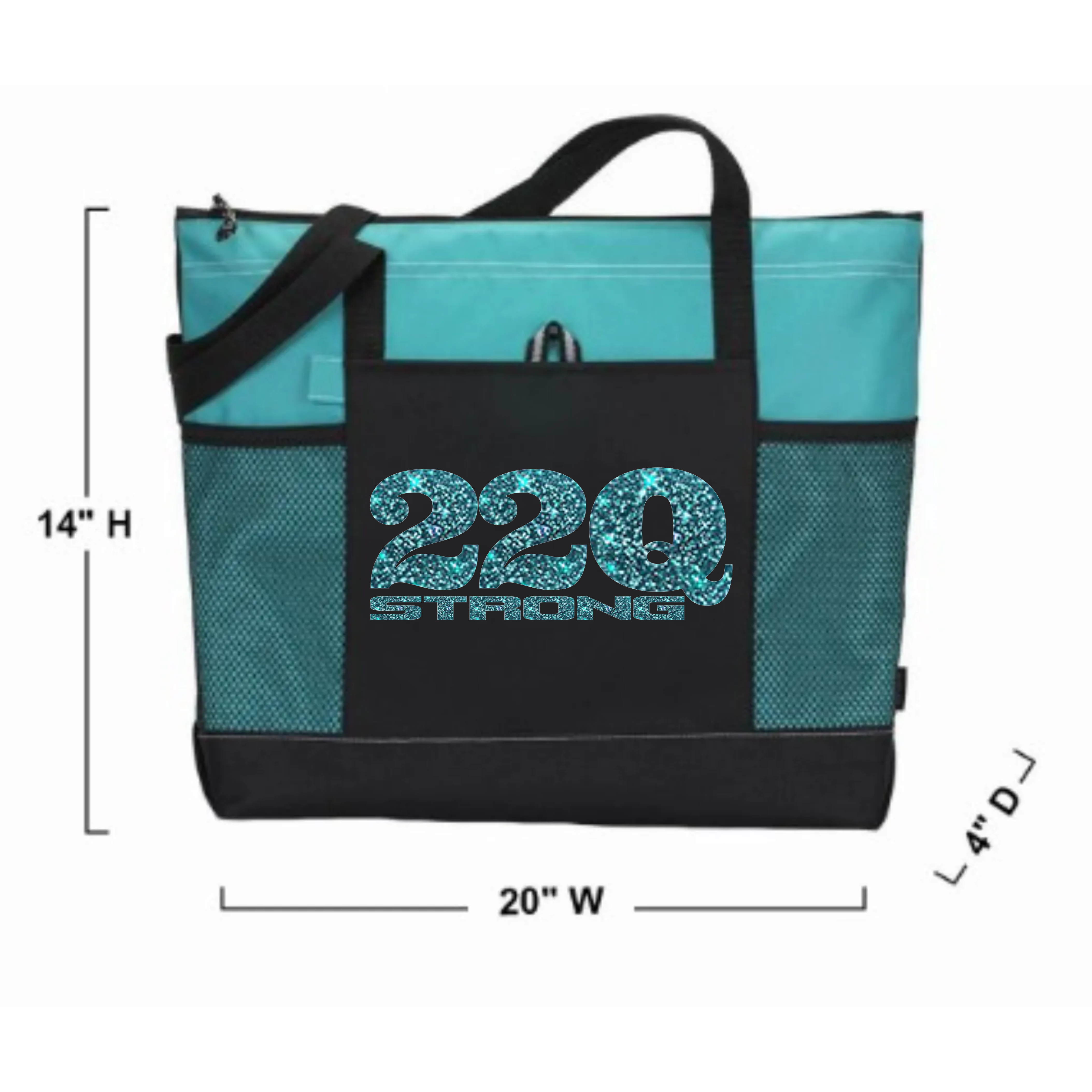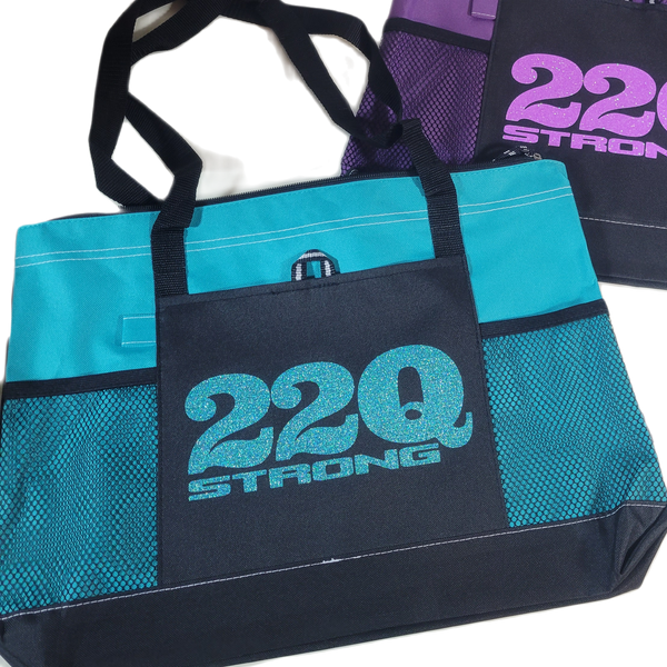 Unleash your advocacy with our bold 22Q STRONG Tote Bag. This aqua stunner features an eye-catching glitter design and bling that demands attention while you spread awareness. Practical black webbing shoulder straps support your mission, while the zippered main compartment keeps your essentials secure. Navigate your day with the convenient front pocket (complete with pen loop) and dual mesh side pockets. This isn't just a bag—it's a statement of strength and solidarity.
