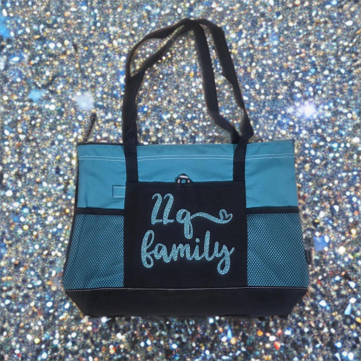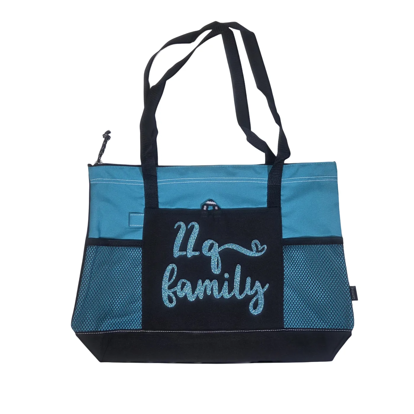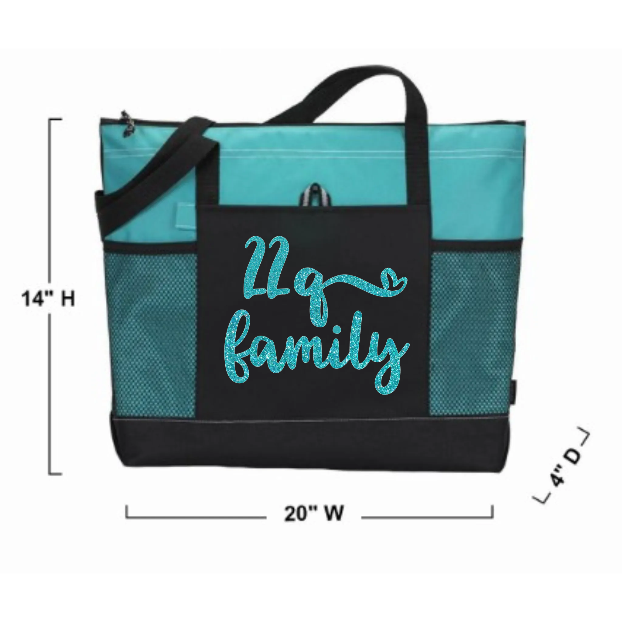 Express your support with the lively aqua 22q family tote bag. Featuring a shimmering glitter design and striking details, it helps you raise awareness with impact. The sturdy black webbing straps ensure comfortable carrying, and the zippered main compartment keeps your items safe. Organize your essentials easily with a front pocket that includes a pen loop and two mesh side pockets. This tote is not just practical—it stands for strength and unity throughout your advocacy journey.