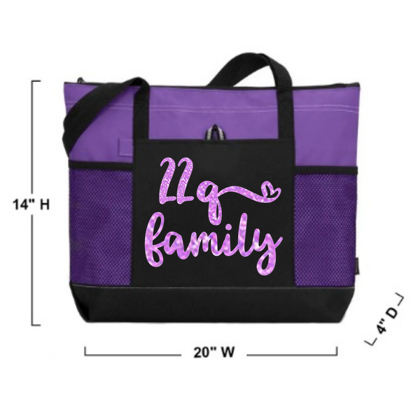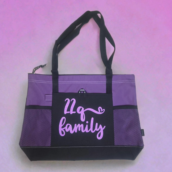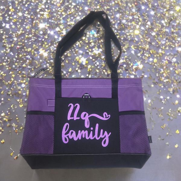 Express your support with the lively purple 22q family tote bag. Featuring a shimmering glitter design and striking details, it helps you raise awareness with impact. The sturdy black webbing straps ensure comfortable carrying, and the zippered main compartment keeps your items safe. Organize your essentials easily with a front pocket that includes a pen loop and two mesh side pockets. This tote is not just practical—it stands for strength and unity throughout your advocacy journey.