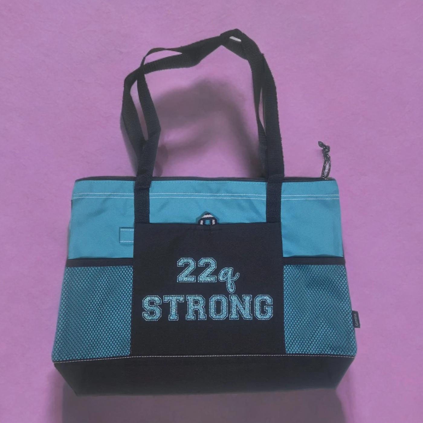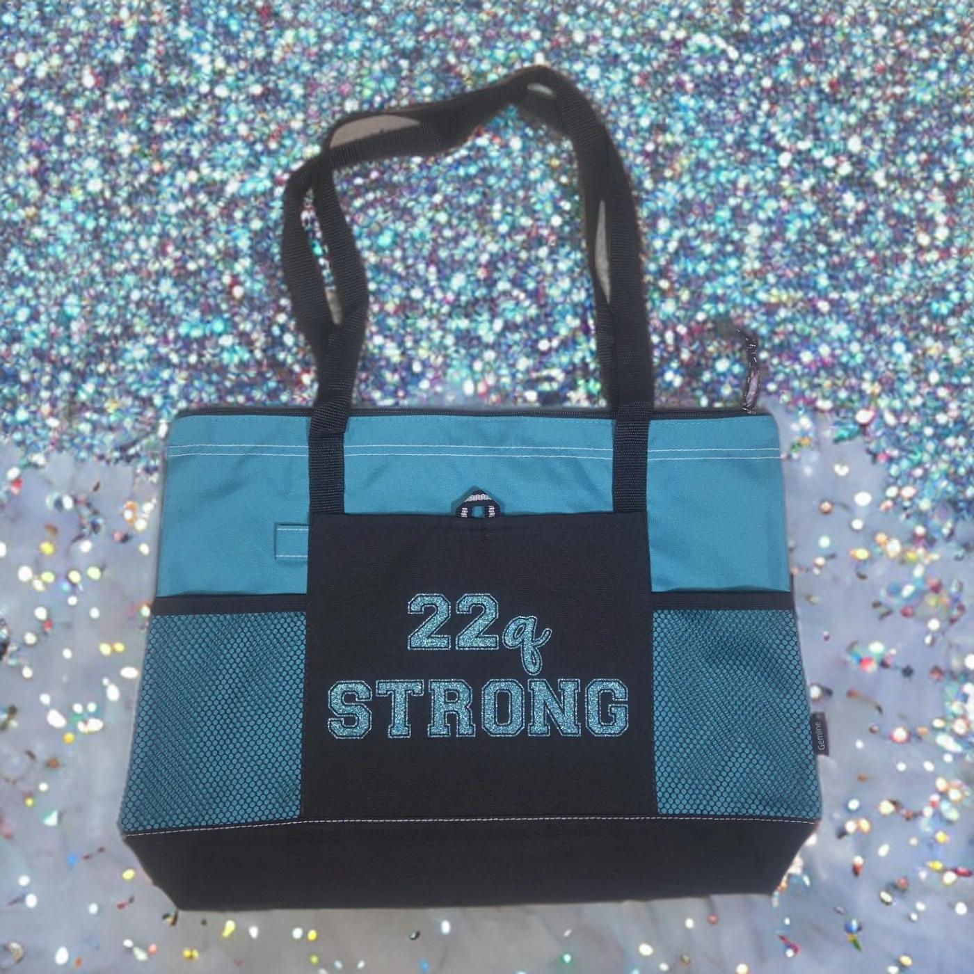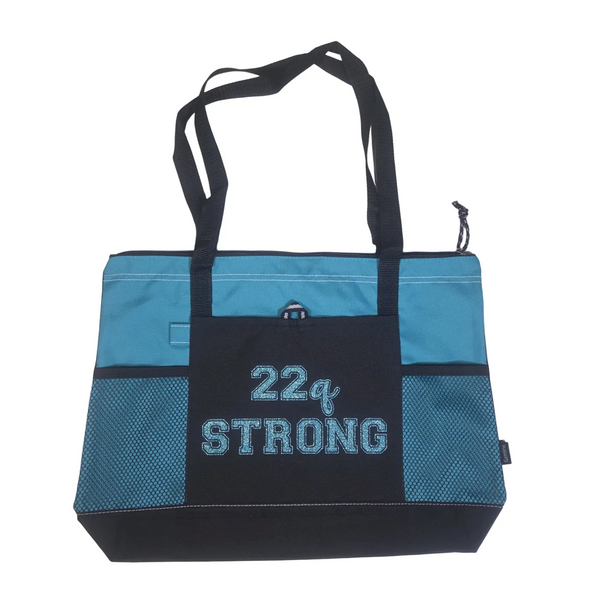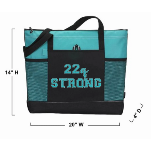 Show your support with the vibrant 22q STRONG Tote Bag in aqua. Its sparkling glitter design and dazzling accents make a powerful statement as you raise awareness. Comfortable black webbing straps provide sturdy carrying, while the zippered main compartment secures your belongings. Stay organized with a handy front pocket featuring a pen loop and two mesh side pockets. More than just a tote, it symbolizes strength and unity in your advocacy journey.