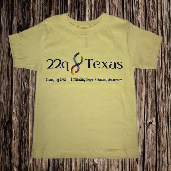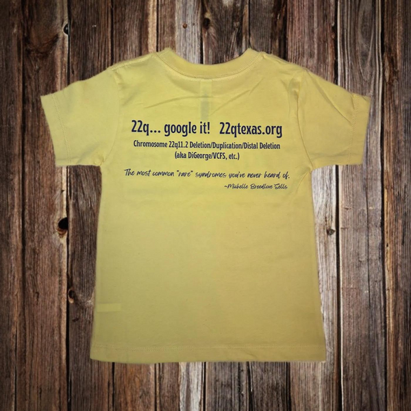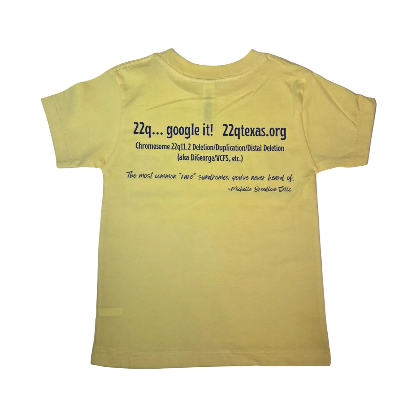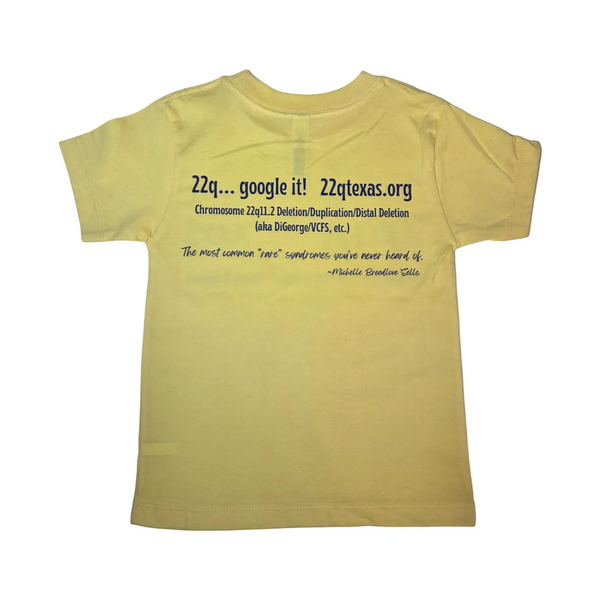 Dress your little one in this sunny yellow toddler shirt featuring our vibrant new 22q Texas logo! Perfect for raising awareness while keeping your tot comfy and stylish. The colorful design catches attention and starts conversations about 22q, all while your toddler looks absolutely adorable!